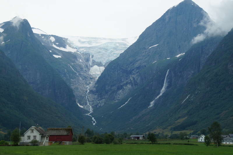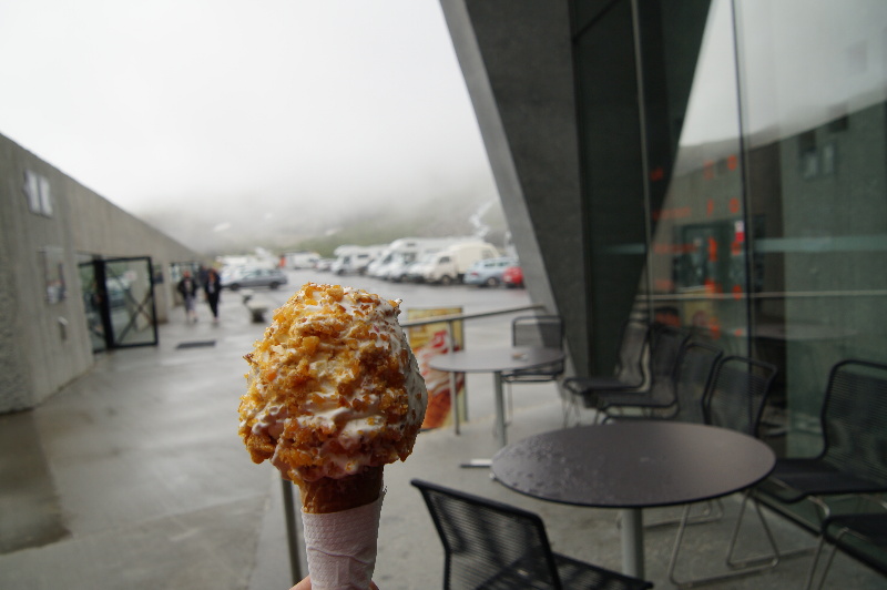 Es regnet die ganze Nacht. Pünktlich zum Frühstück hört es auf und bleibt den Tag trocken. In Byrkjelo haben wir dann bei einer Bäckerei frische Brötchen für morgen geholt. Nebenan eine Tankstelle mit Ablass. In Olden liegt die Black Watch vor Anker. Wir halten zum Bilder machen und gehen im Outlet Klamotten Shoppen. Sind mal echt günstig. Wie wir so zum Fotos machen die Strasse entlang gehen, hupt es. Es ist der Spezi, der so schnell an uns vorbei rauscht, dass ich ihn nur von hinten Fotografieren kann. Da es hier einen Abzweig zum Briksdalbreen gibt und dort so viele Busse hinfahren, beschliessen wir die 50km Umweg zu machen. Wir fahren also zum Gletscher. Es ist halb eins und wir wollen eigentlich nur ein Stück Richtung Gletscher laufen. Nur die Schlappen an, ohne Jacke eigentlich viel zu kalt gehen wir immer weiter. Für die Faulen hätte es auch einen motorisierten Transport gegeben (John Deere). Wir laufen letztendlich bis ganz oben und werden unterwegs sogar noch geduscht. Der Anblick ist grandios. Nach der Rückkehr lesen wir, dass es drei Kilometer waren... Nun haben wir echt Hunger. Wir räumen erstmal den Busparkplatz und stellen uns neben der Strasse zum Mittagessen hin. In Stryn halten wir zum Tanken und machen eine Kaffeepause. Heute gibt’s mal Kaffeestückchen. Die haben wir uns verdient. Im weiteren Verlauf des RV15 fahren wir nicht durch den Tunnelen, sonder biegen auf die alte Straße ab. In vielen Serpentinen schrauben wir uns auf über 1000 Meter. Oben ist ein Skigebiet (jetzt natürlich verwaist). Die Sonne blinzelt ab und zu mal durch. Es sind aber nur noch 15°C. Seit Tagen mal wieder Fernsehempfang, aber kein Internet. Wir übernachten auf dem Plateau. |