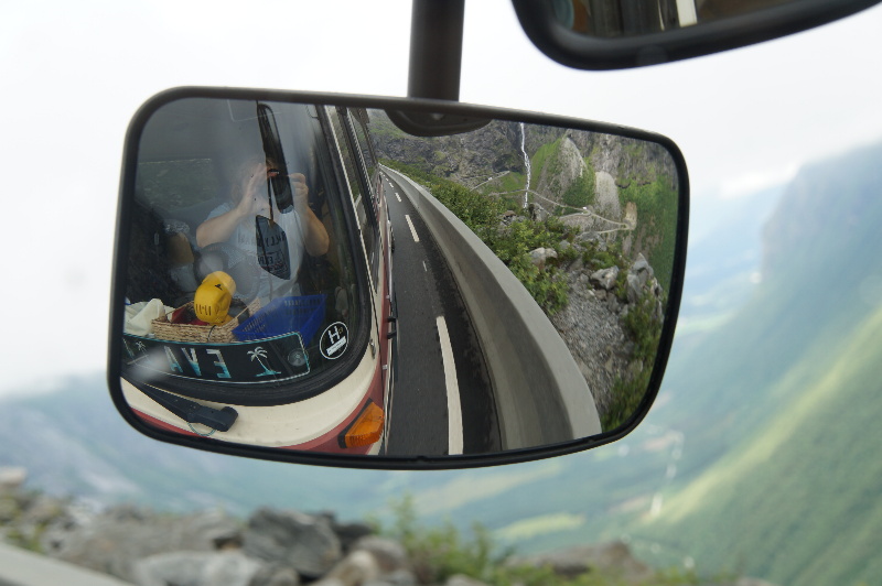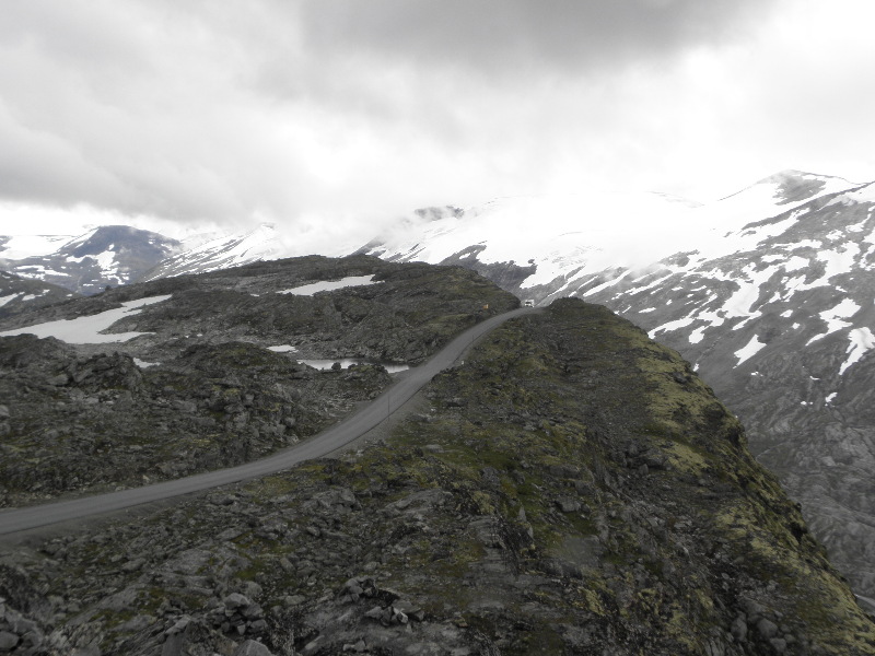 Die Nacht über hat es geregnet. Es waren morgens nur 9°C. Nach dem Frühstück fahren wir bei leichtem Nieselregen weiter auf der dann unbefestigten Gamle Strynefjellsvegen, die 258. Die Schotten würden es single track road nennen. Wir kommen dann zum anderen Ende des Tunnelen, den wir nicht benutzt haben. Kurz danach biegen wir ab zum Dalsnibba. Wohnmobil kostet 100 NOK Maut. Das isses allemal wert (Bus kostet 1050). Man hat von oben eine tolle Aussicht auf den Geirangerfjord. Etwas Sonne hätte gut ausgesehen. Zwischendurch zieht mehrfach der Nebel ins Bild. Da er immer wieder verschwindet, ist es nicht so schlimm. Wir fahren die Serpentinen wieder runter auf die Hauptstraße und weiter runter bis zum Aussichtspunkt über Geiranger. Es ist alles mit Touristen überlaufen. Überall werden Menschenmassen mit Busse heran gekarrt. Wir meiden die Stellplätze und kämpfen uns durch die Menschenmassen ans linke Fjordufer. Drei große Schiffe sind im Fjord. Da das Wetter nicht so toll ist, fahren wir weiter auf dem Trollstiegenveien, bis wir auf halbem Weg zur nächsten Fähre einen Rastplatz an einem See finden (Toiletten vorhanden). Hier bleiben wir über Nacht. |
